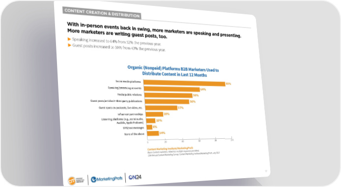 CONTENT CREATION & DISTRIBUTION With in-person events back in swing, more marketers are speaking and presenting. More marketers are writing guest posts, too. ▶Speaking increased to 64% from 52% the previous year. ▶Guest posts increased to 50% from 43% the previous year. Organic (Nonpaid) Platforms B2B Marketers Used to Distribute Content in Last 12 Months Social media platforms 95% Speaking/presenting at events 64% Media/public relations 56% Guest posts/articles in third-party publications 50% Guest spots on podcasts, live video, etc. 37% Influencer partnerships 20% Listening platforms (e.g., social audio, 10% Audible, Apple Podcasts) SMS/text messages 6% None of the above 14% 0 20 40 60 80 100 Content Marketing Institute/MarketingProfs Base: Content marketers. Aided list; multiple responses permitted. 13th Annual Content Marketing Survey: Content Marketing Institute/MarketingProfs, July 2022 17