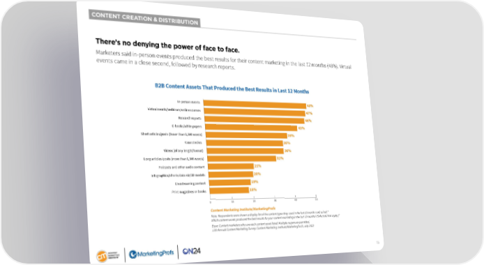 CONTENT CREATION & DISTRIBUTION There’s no denying the power of face to face. Marketers said in-person events produced the best results for their content marketing in the last 12 months (48%). Virtual events came in a close second, followed by research reports. B2B Content Assets That Produced the Best Results in Last 12 Months In-person events 48% Virtual events/webinars/online courses 47% Research reports 46% E-books/white papers 43% Short articles/posts (fewer than 1,500 words) 39% Case studies 36% Videos (of any length/format) 36% Long articles/posts (more than 1,500 words) 32% Podcasts and other audio content 21% Infographics/charts/data viz/3D models 20% Livestreaming content 19% Print magazines or books 18% 0 10 20 30 40 50 Content Marketing Institute/MarketingProfs Note: Respondents were shown a display list of the content types they used in the last 12 months and asked, “ Which content assets produced the best results for your content marketing in the last 12 months? (Select all that apply.)” Base: Content marketers who use each content asset listed. Multiple responses permitted. 13th Annual Content Marketing Survey: Content Marketing Institute/MarketingProfs, July 2022 15