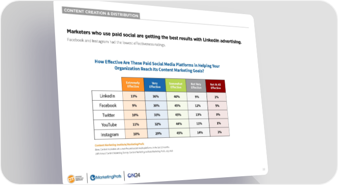 CONTENT CREATION & DISTRIBUTION Marketers who use paid social are getting the best results with LinkedIn advertising. Facebook and Instagram had the lowest effectiveness ratings. How Effective Are These Paid Social Media Platforms in Helping Your Organization Reach Its Content Marketing Goals? Extremely Very Somewhat Not Very Not At All Effective Effective Effective Effective Effective LinkedIn 13% 36% 40% 9% 2% Facebook 9% 30% 45% 12% 5% Twitter 10% 33% 45% 13% 0% YouTube 11% 32% 44% 11% 1% Instagram 10% 29% 45% 14% 3% Content Marketing Institute/MarketingProfs Base: Content marketers who used the paid social media platforms in the last 12 months. 13th Annual Content Marketing Survey: Content Marketing Institute/Marketing Profs, July 2022 22