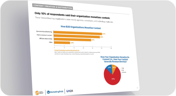 CONTENT CREATION & DISTRIBUTION Only 10% of respondents said their organization monetizes content. These forward-leaning organizations were mostly agencies, consultants, and technology marketers. How B2B Organizations Monetize Content Sponsorships/advertising 52% Paid or premium content 48% Affiliate relationships 39% Other 16% 0 10 20 30 40 50 60 Content Marketing Institute/MarketingProfs Base: Content marketers whose organizations monetize their content. Aided list; multiple responses permitted. 13th Annual Content Marketing Survey: Content Marketing Institute/MarketingProfs, July 2022 D o e s Y o u r O r g a n i z a t i o n M o n e t i z e I t C s o n t e n t ( i . e . , D o e s Y o u r C o n t e n G t e n e r a t e R e v e n u e D i r e c t l y ) ? 13% 10% ■ Yes ■ No ■ Unsure 77% 23