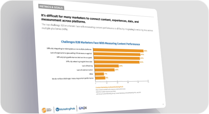 METRICS & GOALS It’s difficult for many marketers to connect content, experiences, data, and measurement across platforms. The top challenge B2B marketers face with measuring content performance is difficulty integrating/correlating data across multiple platforms (48%). Challenges B2B Marketers Face With Measuring Content Performance Difficulty integrating/correlating data across multiple platforms 48% Lack of organizational goal-setting KPIs to measure against 45% Difficulty tying performance data back to our goals 43% Difficulty extracting insights from data 42% Lack of training 23% Lack of communication 18% Other 7% We do not face challenges measuring content performance 9% 0 10 20 30 40 50 Content Marketing Institute/MarketingProfs Base: Content marketers who measure content performance. Aided list; multiple responses permitted. 13th Annual Content Marketing Survey: Content Marketing Institute/Marketing Profs, July 2022 31