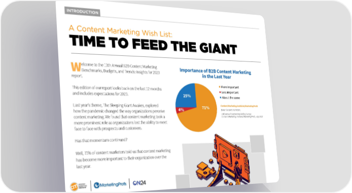 INTRODUCTION A Content Marketing Wish List: TIME TO FEED THE GIANT Welcome to the 13th Annual B2B Content Marketing Importance of B2B Content Marketing Benchmarks, Budgets, and Trends: Insights for 2023 in the Last Year report. ■ More important This edition of our report looks back on the last 12 months ■ Less important and includes expectations for 2023. 25% ■ About the same Last year’s theme, The Sleeping Giant Awakes, explored 71% Content Marketing Institute/MarketingProfs how the pandemic changed the way organizations perceive 4% Base: Content marketers. 13th Annual Content Marketing Survey: content marketing. We found that content marketing took a Content Marketing Institute/MarketingProfs, July 2022 more prominent role as organizations lost the ability to meet face to face with prospects and customers. Has that momentum continued? Well, 71% of content marketers told us that content marketing has become more important to their organization over the last year. 33
