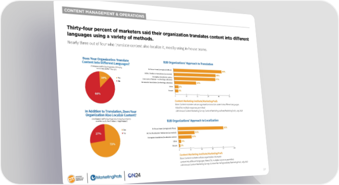 CONTENT MANAGEMENT & OPERATIONS Thirty-four percent of marketers said their organization translates content into different languages using a variety of methods. Nearly three out of four who translate content also localize it, mostly using in-house teams. D o e s Y o u r O r g a n i z a t i o n T r a n s l a t C e B2B Organizations’ Approach to Translation o n t e n t I n t o D i ff e r e n t L a n g u a g e s ? ( T r a n s l a t i o n i s d e fi n e d a s t h e p r o c e s s o f c h a n g i n g In-house team (or regional offices) 46% c o n t e n t i n t o a n o t h e r l a n g u a g e . ) Ad hoc freelance translators (as needed) 38% Enterprise translation service 37% 34% ■ Yes (outsourced human + technology solutions) ■ No Automated translation (technology solutions) 20% Other 5% Unsure 4% 66% 0 10 20 30 40 50 Content Marketing Institute/MarketingProfs Base: Content marketers whose organizations translate content into different languages. Aided list; multiple responses permitted. I 13th Annual Content Marketing Survey: Content Marketing Institute/MarketingProfs, July 2022 n A d d i t i o n t o T r a n s l a t i o n , D o e s Y o u O r r g a n i z a t i o n A l s o L o c a l i z e C o n t e n t ? ( L o c a l i z a t i o n i s d e fi n e d a s t h e p r o c e s s o f a d a p t i n g c o n t e n t t o m e e t t h e n e e d s o f l o c a l c u l t u r e o r t a r g e t m a r k e t . ) B2B Organizations’ Approach to Localization ■ Yes In-house team (or regional offices) 82% 27% ■ No Ad hoc localization freelancers (as needed) 31% Enterprise translation/localization service 22% 73% Other 5% Unsure 2% 0 20 40 60 80 100 Content Marketing Institute/MarketingProfs Base: Content marketers whose organizations translate content into different languages. Aided list; multiple responses permitted. 13th Annual Content Marketing Survey: Content Marketing Institute/MarketingProfs, July 2022 27