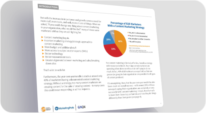 INTRODUCTION But with the increase in importance and growth comes a need for Percentage of B2B Marketers more staff, more tools, and well, more of a lot of things. When we With a Content Marketing Strategy asked, “If you could change one thing about content marketing in your organization, what would that be?” many of those same 7% ■ Yes, and it is documented marketers told us they are still fighting for: ■ Yes, but it is not documented ■ No, but plan to within 12 months ▶ Content marketing buy-in 20% 40% ■ No, with no plans ▶ A content marketing strategy/strategic approach to content marketing Content Marketing Institute/MarketingProfs Base: Content marketers ▶ More budget and additional staff 33% 13th Annual Content Marketing Survey: ▶ More access to subject matter experts (SMEs) Content Marketing Institute/MarketingProfs, July 2022 ▶ Better technology ▶ Better measurement tools ▶ Greater alignment between marketing and sales/breaking down silos For content marketing to be truly effective, it needs a strategy with resources behind it. Too many content marketers are That’s a lot to wish for. operating either alone or with a small staff trying to do too much. In fact, 46% of all marketers surveyed told us that one Furthermore, the year-over-year needle is stuck at around only person (or group) in their organization is responsible for all types 40% of marketers having a documented content marketing of content produced. strategy. Without a strategy, too many content marketers are It’s unsurprising, then, that the year-over-year needle has also creating content for the sake of creating content – in many cases been stuck on overall success – with around 29% of those this could mean responding to ad hoc requests. surveyed saying their organizations are extremely or very successful with content marketing. Indeed, there is much to learn from those top performers and how they do things differently than their peers (see page 8). 4